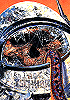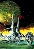 kniender Raumfahrer erhebt Faust drohend zu grünem Mann, im Hintergrund Sonne mit Materiespirale und riesiges Auge, siehe auch