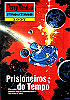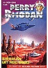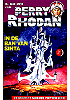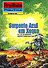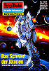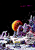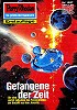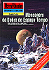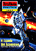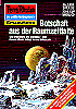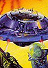 Raumfahrer und eiförmige Bombe vor Felssäulen, am Himmel radförmige Raumstation |