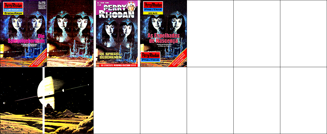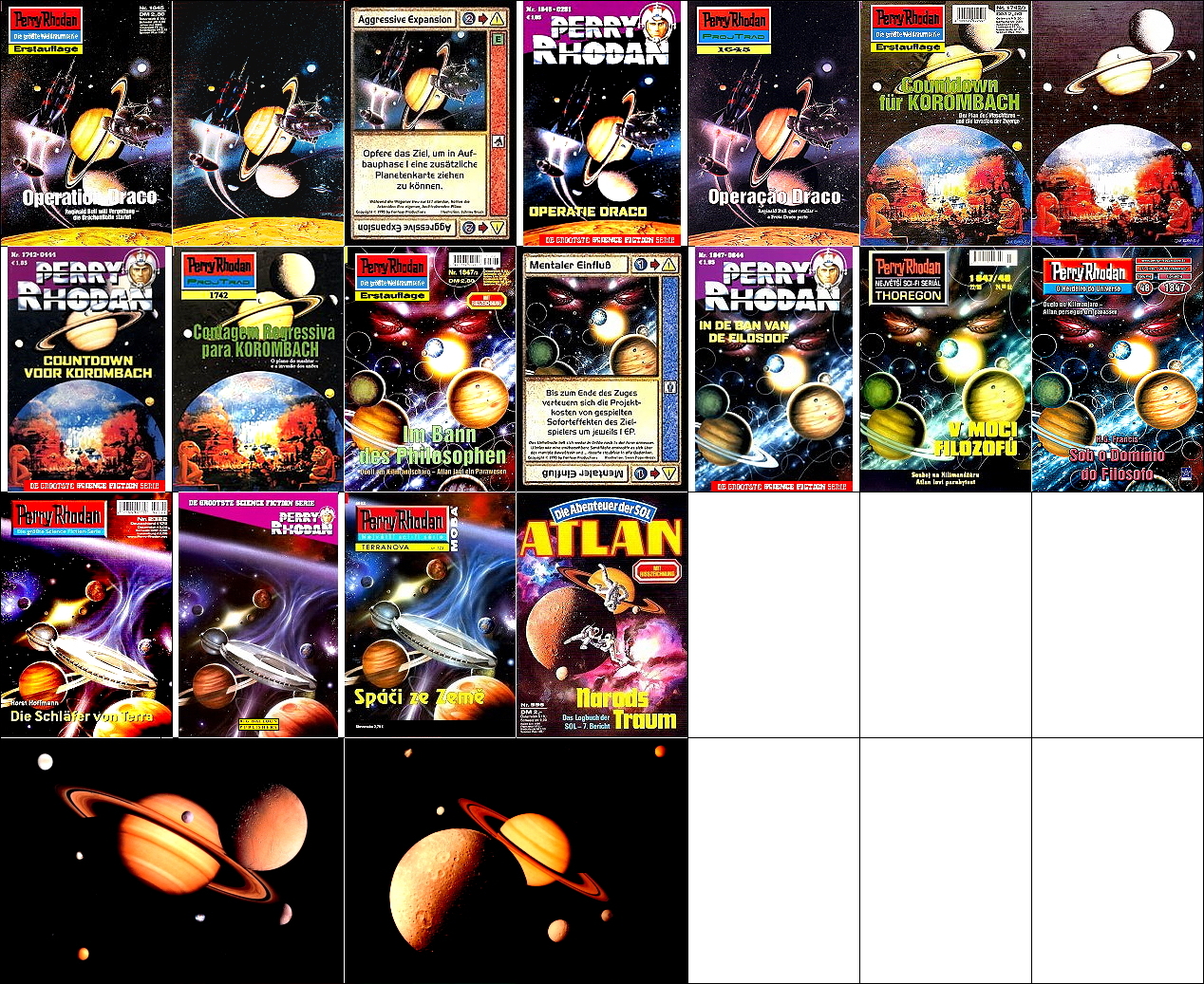 ähnliche Motive, 1 - 5, 6 - 9, 10 - 14, 15 - 17 gleiches Bild, Saturn in 1 und 6 von 22 übernommen (man beachte den kleinen Mond vor der Planetenscheibe), Saturn und Mond in 18 von 23 übernommen |
