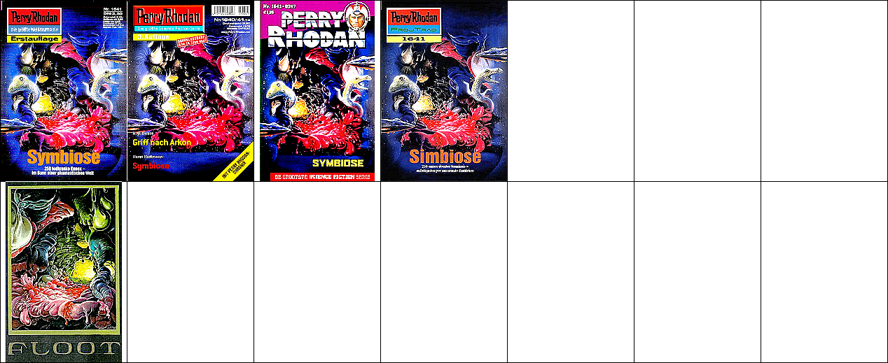ähnliche Motive, 1 - 4, 5 - 9, 10 - 12 gleiches Bild, in 10 kommen beide Bögen aus 1 und 5 vor, 15 ist die Collagevorlage für den Bogen in 1 und den vorderen Bogen in 10, 16 ist das Vorbild für den Bogen in 5 und den hinteren in 10, das Raumschiff in 1 ist von 17 bzw. 18 nachgezeichnet |