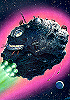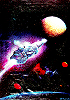 schemenhaft angeleuchtetes Raumboot zwischen Planeten |