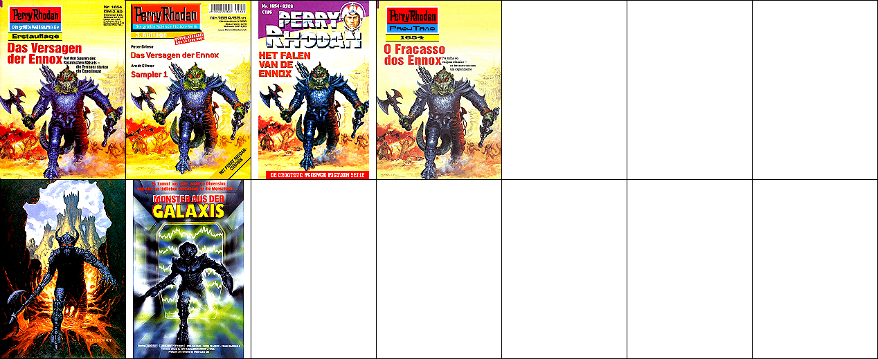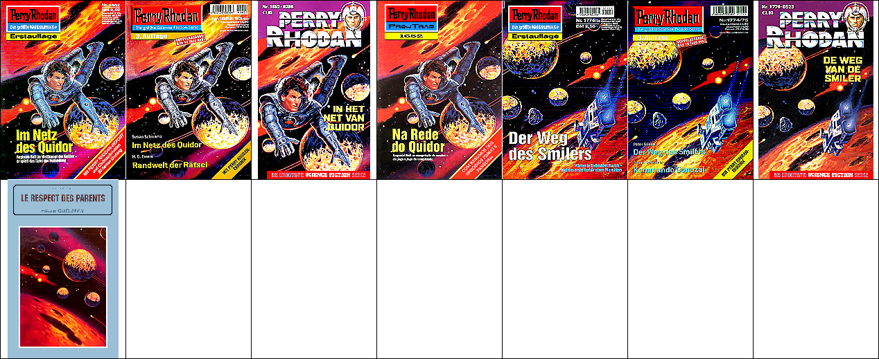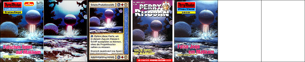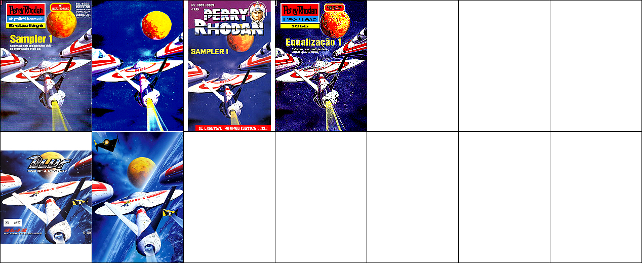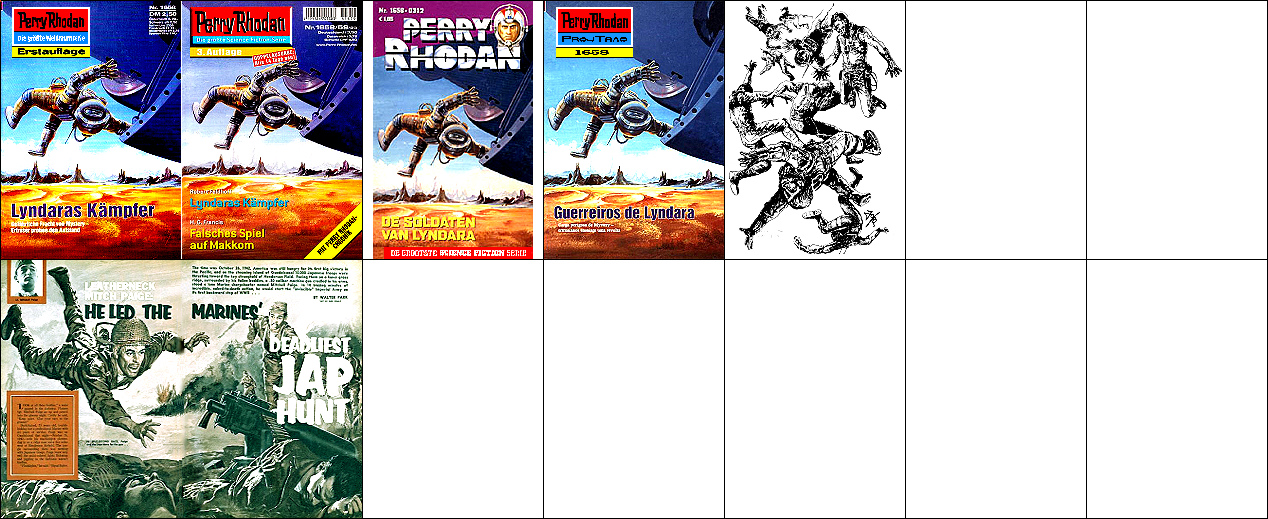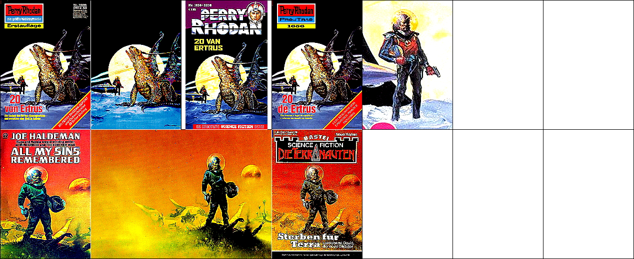 1 - 4 gleiches Bild, der Hintergrund ist umgedreht komplett auch für 5 verwendet, 5 - 7 gleiches Bild. Die Grafik, welche auch als Titelbild für 8 verwendet wurde, ist die Vorlage, die für 1 und 5 mit einem Raumfahrer bzw. mit Raumbooten ergänzt wurde (8 ist später als die beiden PR-Hefte erschienen). |