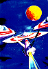 Raumfahrer und geflügeltes Reptil auf Mond mit Ringplaneten, siehe auch