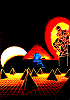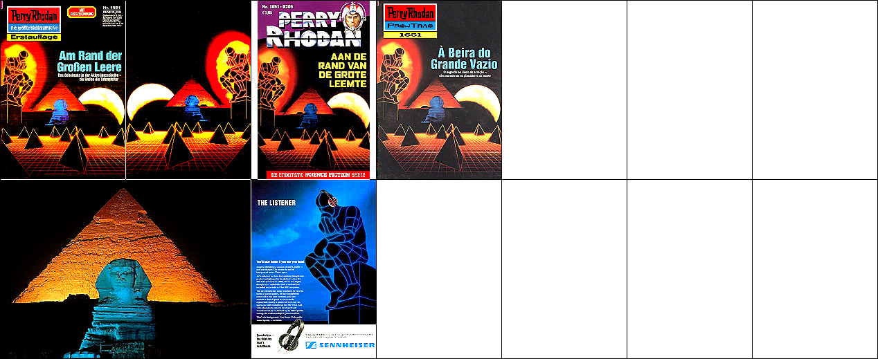 1 - 4 gleiches Bild, 2 seitenverkehrt, die Sphinx und die Pyramide sind von 8 übernommen, der schattenhafte Mann von 9 nachgezeichnet |