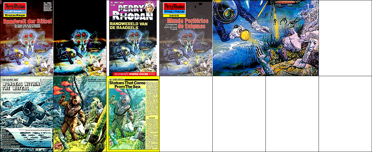1 - 4 gleiches Bild, der Taucher ist seitenverkehrt von 8 nachgezeichnet, die Szene am rechten unteren Bildrand mit dem aus dem Stein herausragenden Arm und dem Kopf einer Statue ist von 9 bzw. 10 übernommen und eingeklebt (man beachte auch den mitgenommenen Rest des Beines des Tauchers), 9 - 10 gleiches Bild |