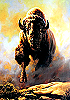 galoppiernder Bison, daneben offener Schweber mit Menschen |