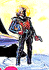 Außerirdischer mit Axt und Strahler in den Händen |