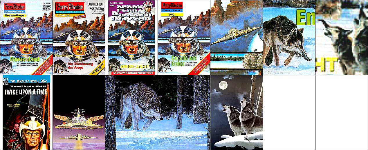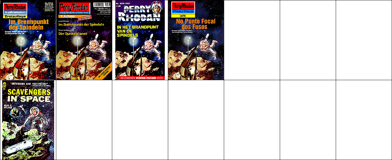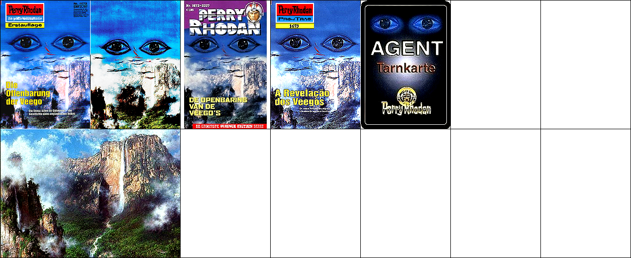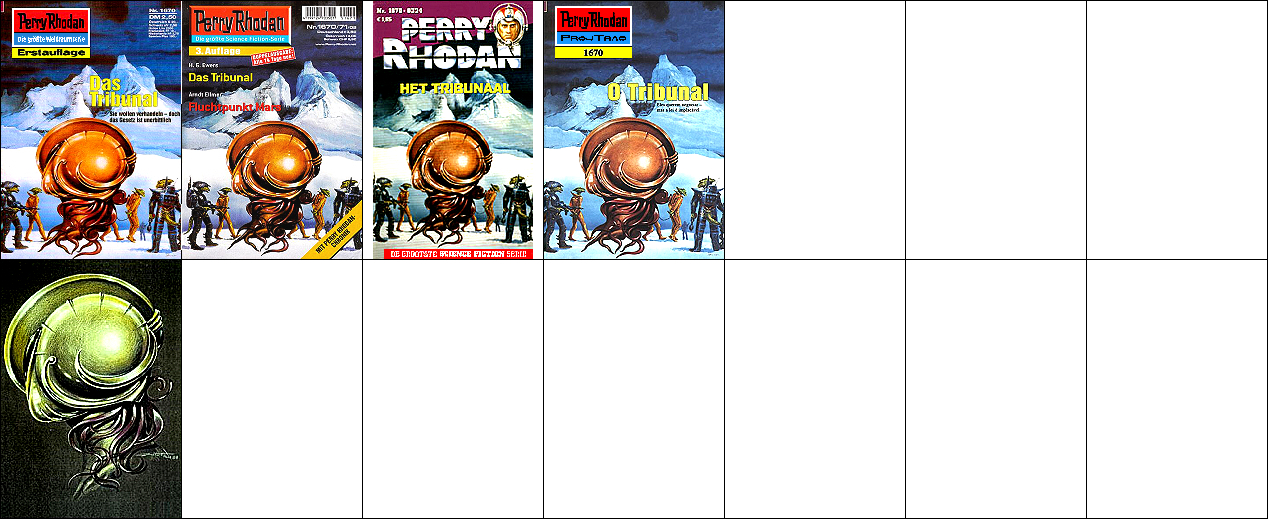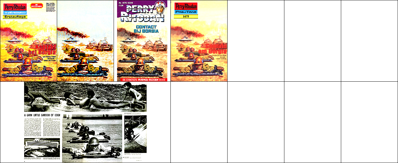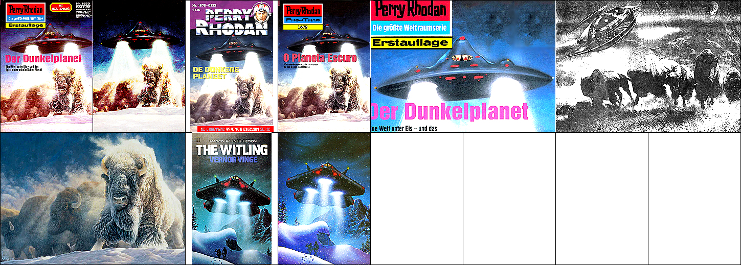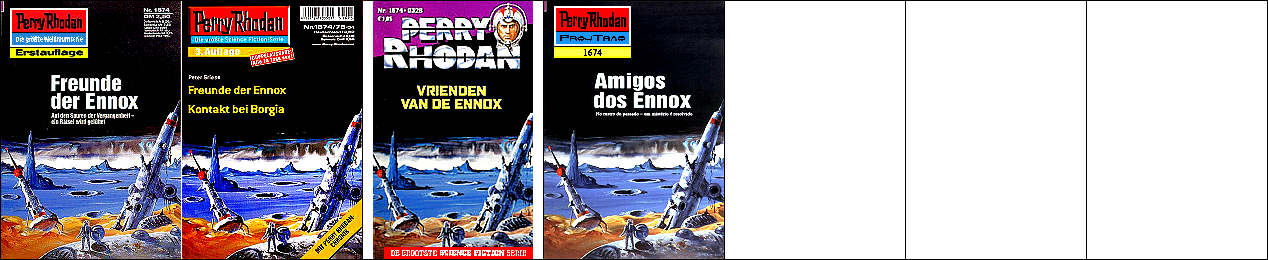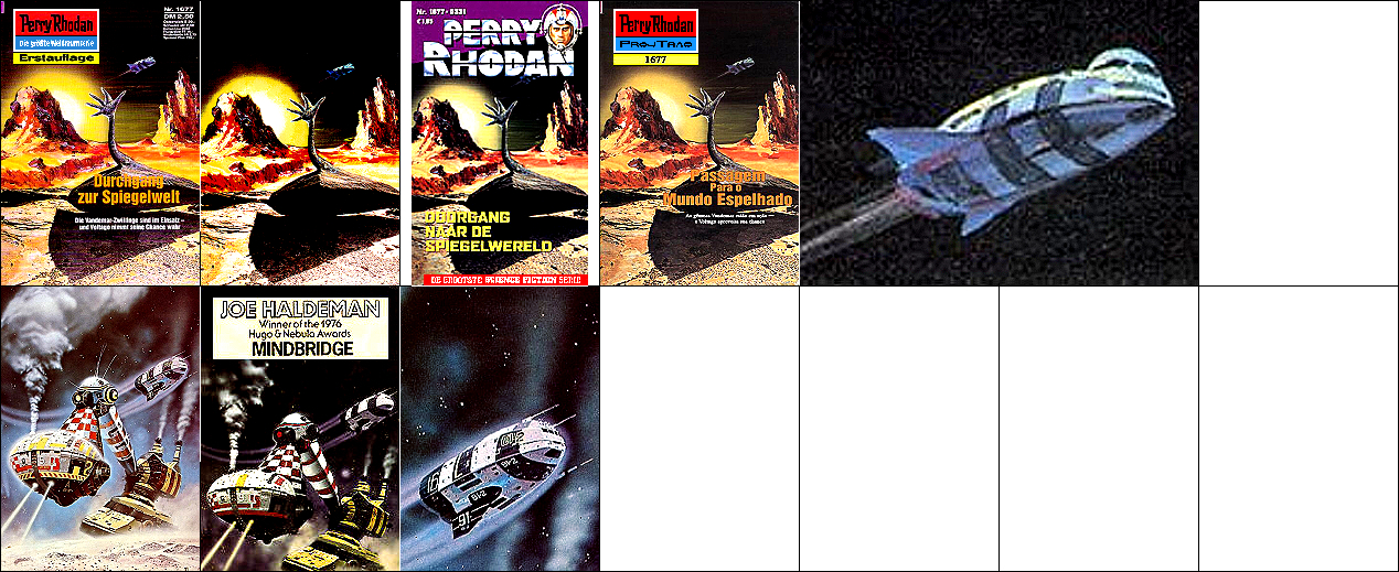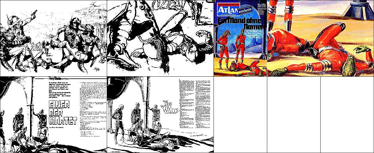 1 - 4 gleiches Bild, der Helm des Mannes ist von 8 nachgezeichnet, das Raumboot links von ihm von 9, der Wolf unten ist von 10, die beiden Wölfe rechts unten sind von 11 übernommen (in den deutschen und der brasilianischen PR-Ausgabe sind sie vom schrägen Balken verdeckt) |