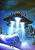 zwei drohend blickende Augen über Felswand mit Wasserfall |