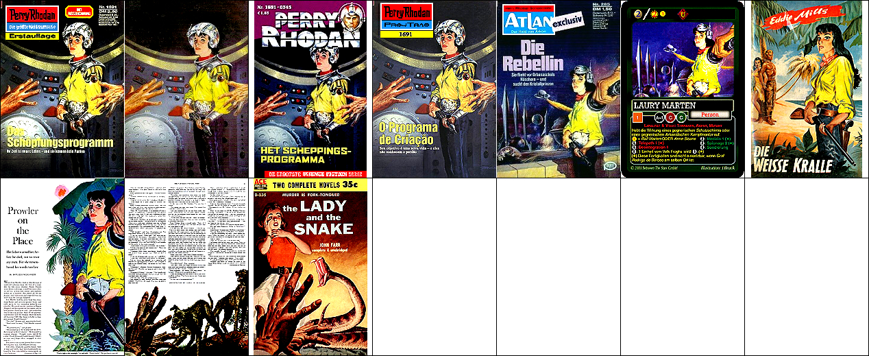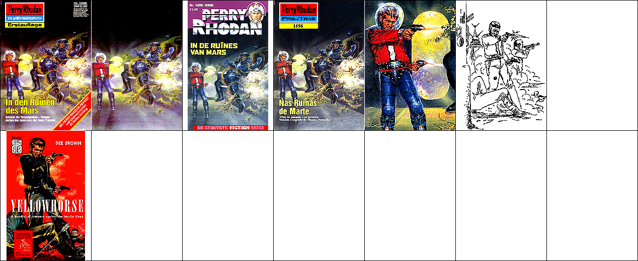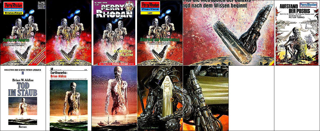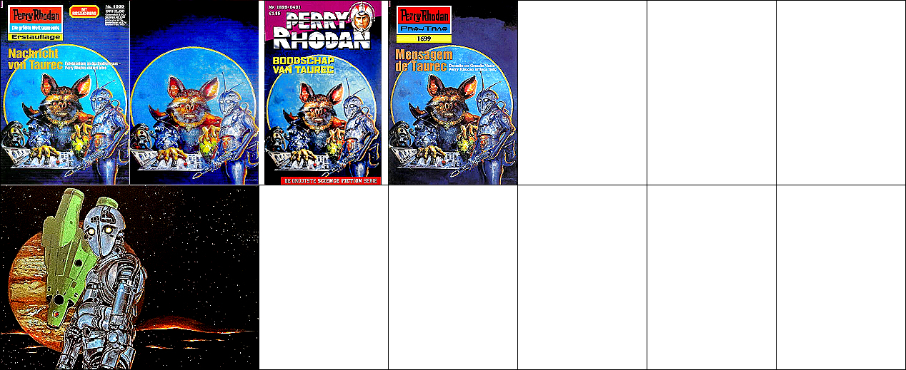 ähnliche Motive, 1 - 4 gleiches Bild, 5 sehr ähnlich, schwarzweiß, 9 - 10, 11 - 12 gleiches Bild, jeweils mit überarbeitetem Hintergrund, 13 Neuinterpretation von 11 für Neuauflage, 15 Vorbild für den Schweber samt Besatzung in 1, 16 für 5, 17 für 9 |
