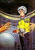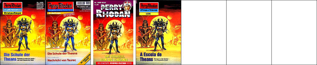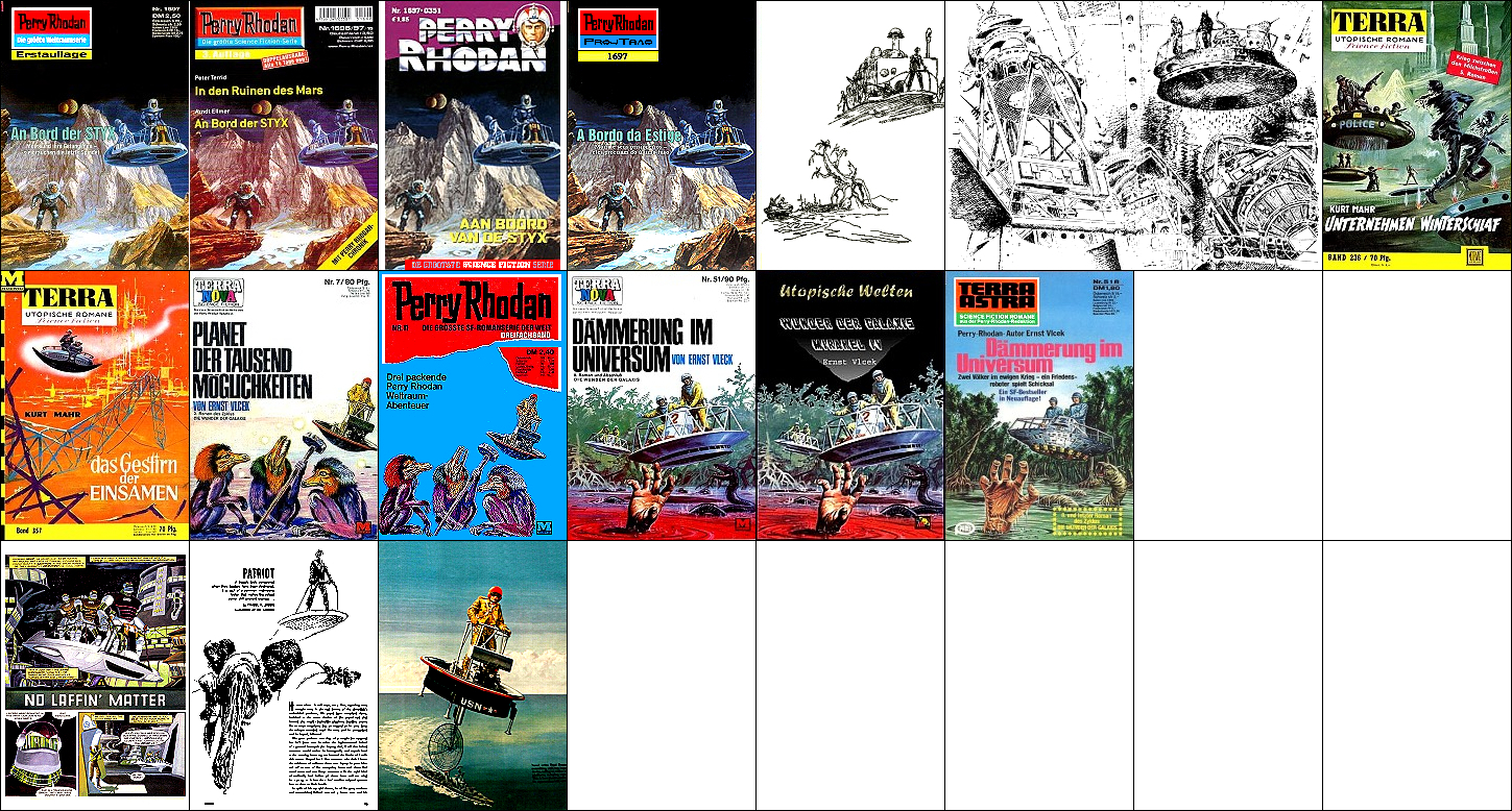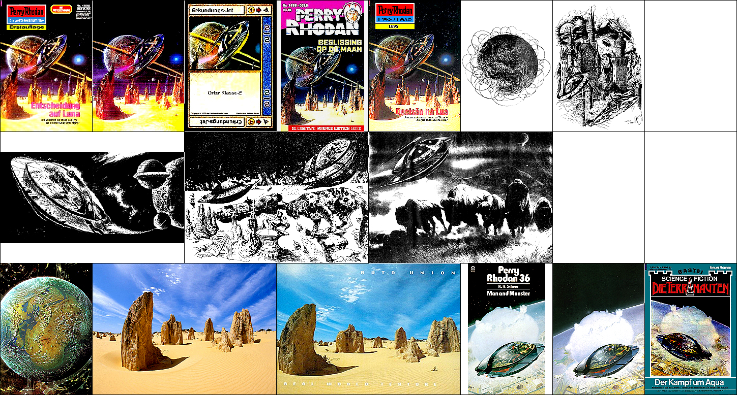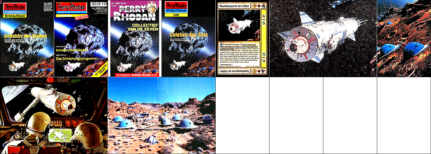 1 - 5 gleiches Bild, 3 Ausschnitt, der Planet kommt ohne Ring auch in 6 vor und ist von 15 nachgezeichnet bzw. in 1 eingeklebt, in den weiteren Bildern ähnliches Raumboot wie in 1, wobei 10 sehr ähnlich ist, die Sandwüste mit den stehenden Steinen wurde von der Pinnacle Rock Formation, Naumburg Nationalpark, Australien, übernommen (man beachte den Schattenwurf der Steine) und die Steinspitzen verlängert, 18 bzw. 19 ist das Vorbild für die Raumboote, wobei es in 1 eingeklebt und übermalt wurde |