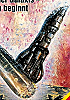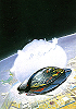 Raumboot über Mond mit Felsnadeln, im Hintergrund Ringplanet, siehe auch