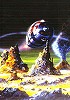 bleistiftförmiges Raumschiff über vulkanischer Landschaft, siehe auch