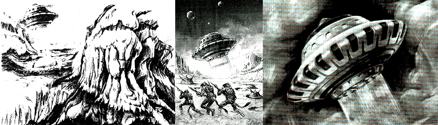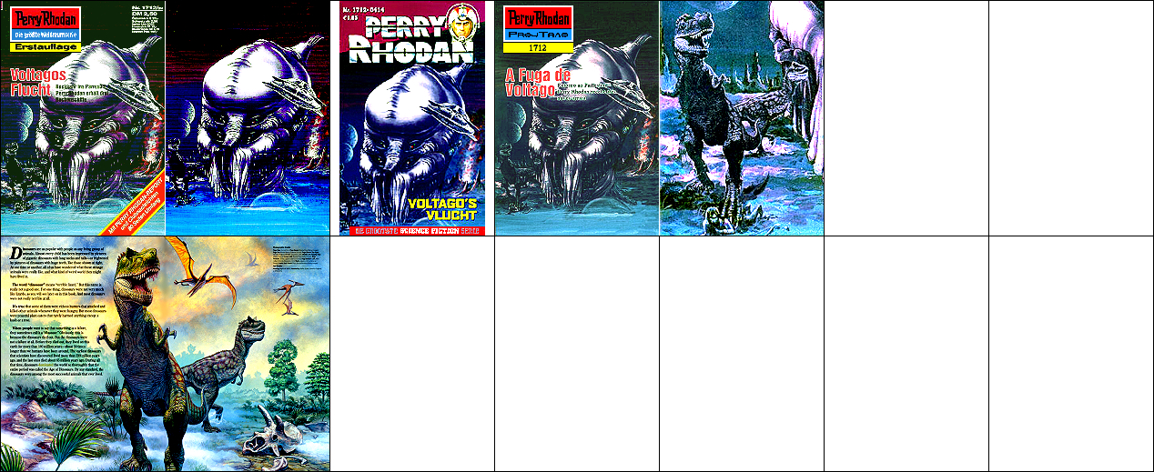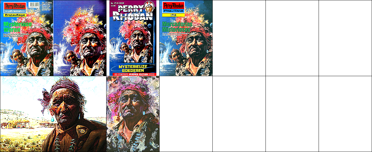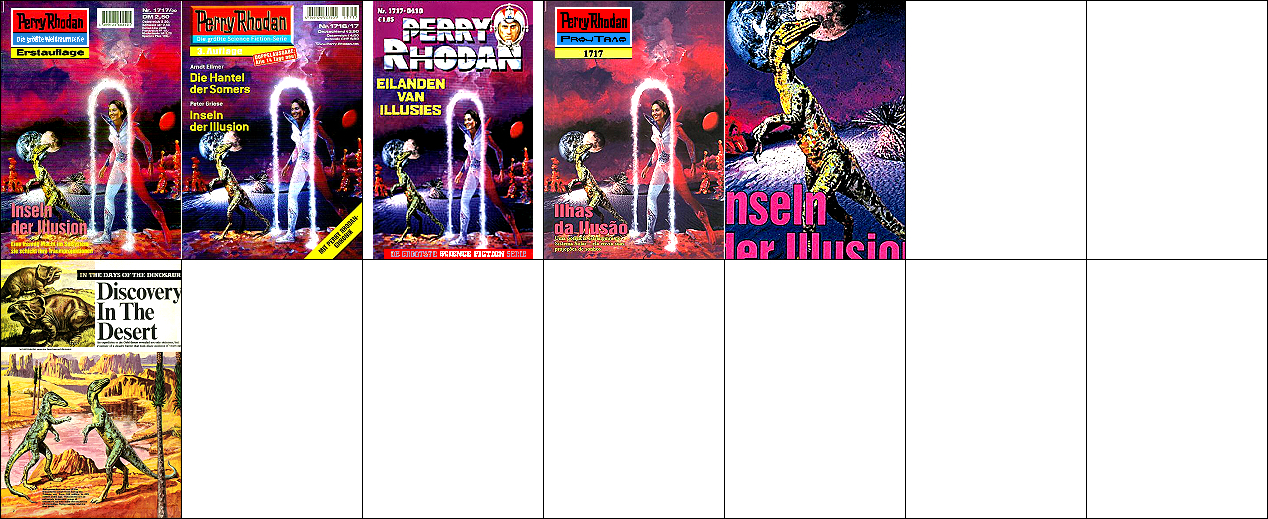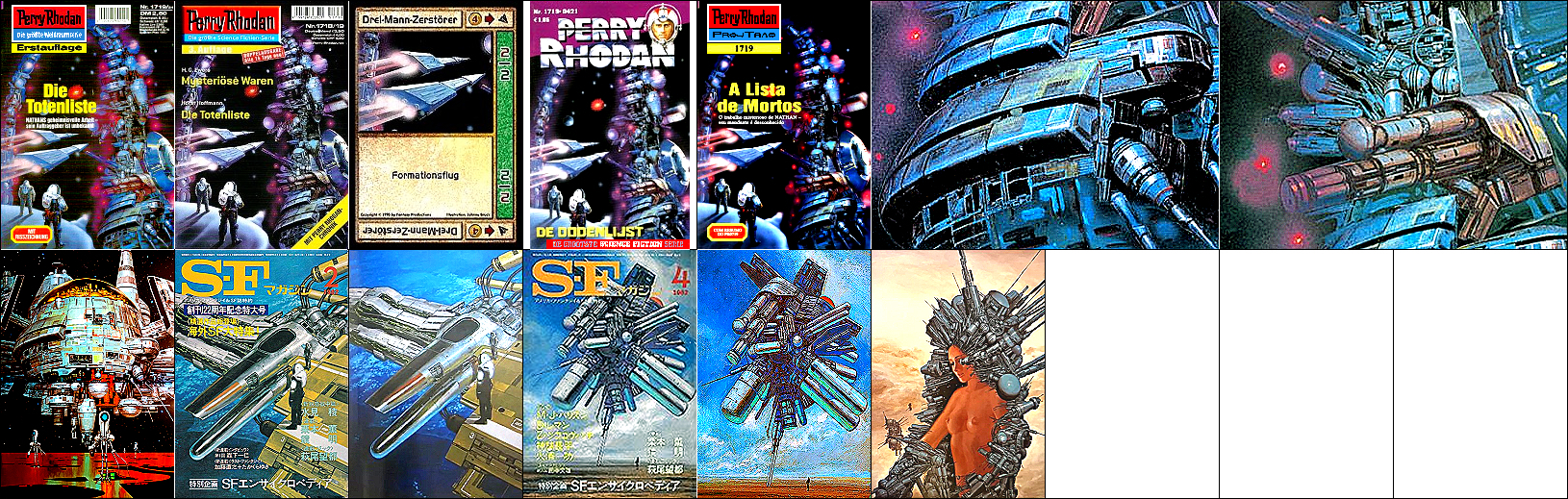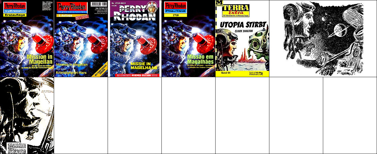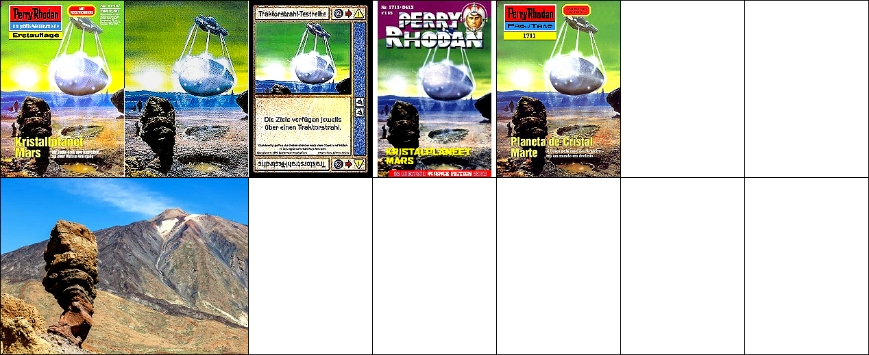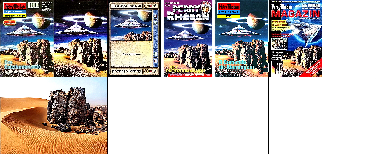 1 - 4 gleiches Bild, 3 vergrößerter Ausschnitt, die Bilder von 8 - 13 dienten Vorlagen für die Komponenten des Weltraumtores, aus denen Teile ausgeschnitten und ins Titelbild eingeklebt wurden |