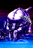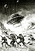 riesiger ballartiger Außerirdischer mit Rüssel und vier Armen, davor Diskusraumboot und Tyrannosaurus, davor Diskusraumboot und Tyrannosaurus, siehe auch