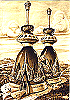 2 kegelartige Türme, einer davon mit Radarschüsseln |