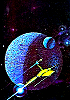 Raumboote vor Planetenkugeln und im Zentrum erleuchtetem Spiralnebel, siehe auch
