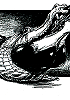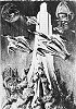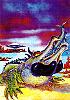 Wesen mit Körper eines Eisbärs, Kopf eines Nashorns, Geweih und Rattenschwanz mit Kordel, am Himmel abstürzendes brennendes Kugelraumschiff |