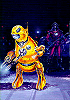 Außerirdischer im Raumanzug, aus dessen kleiner Sichtöffnung Strahl weggeht |