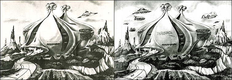Gebäude identisch, in 2 mit Aufschrift ergänzt, Flugobjekte rundherum unterschiedlich |