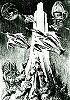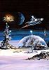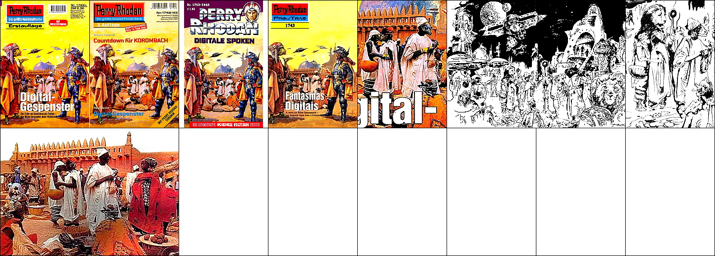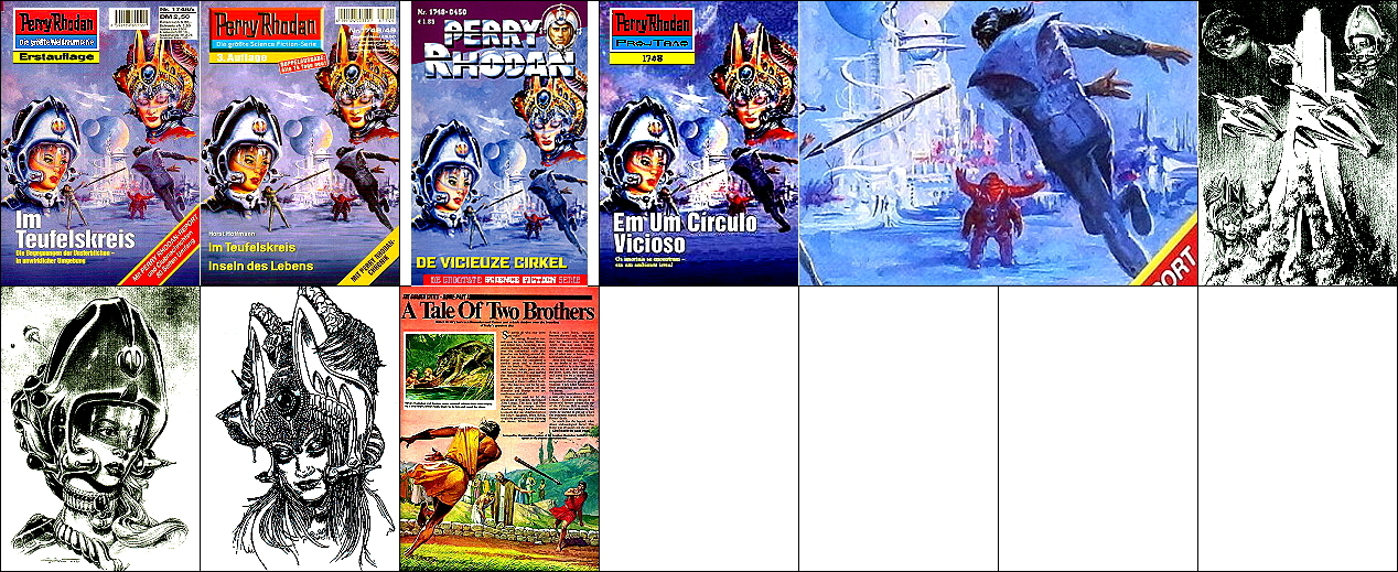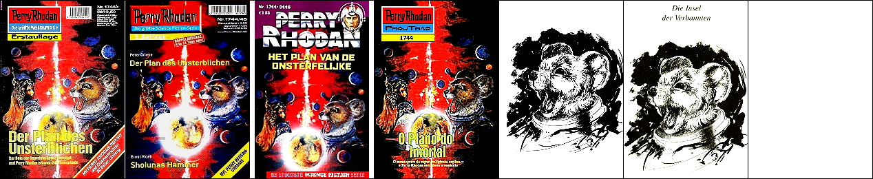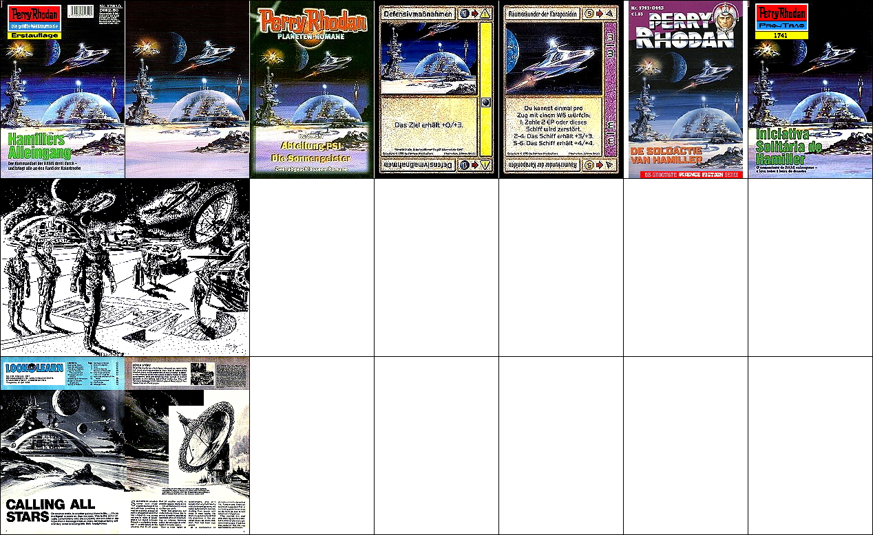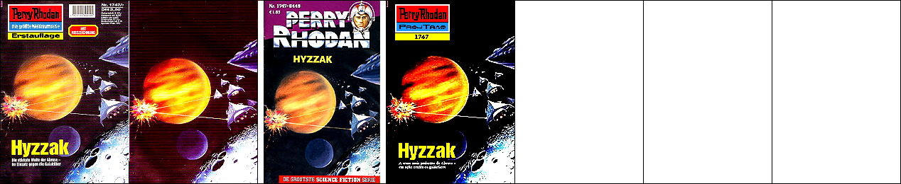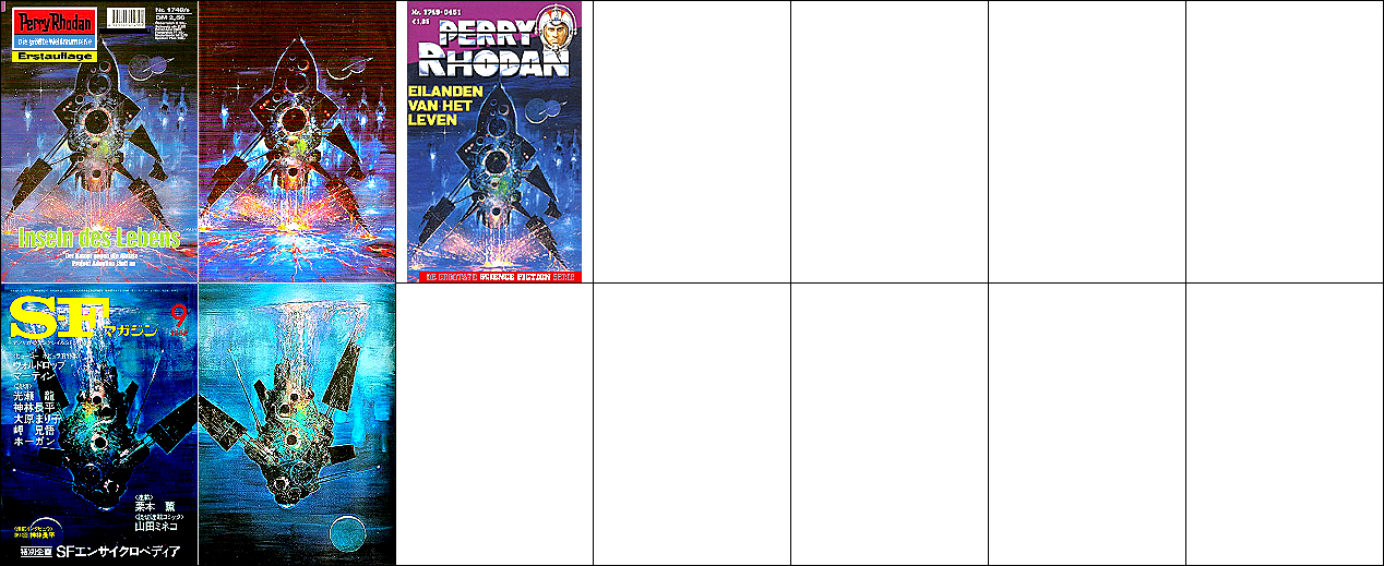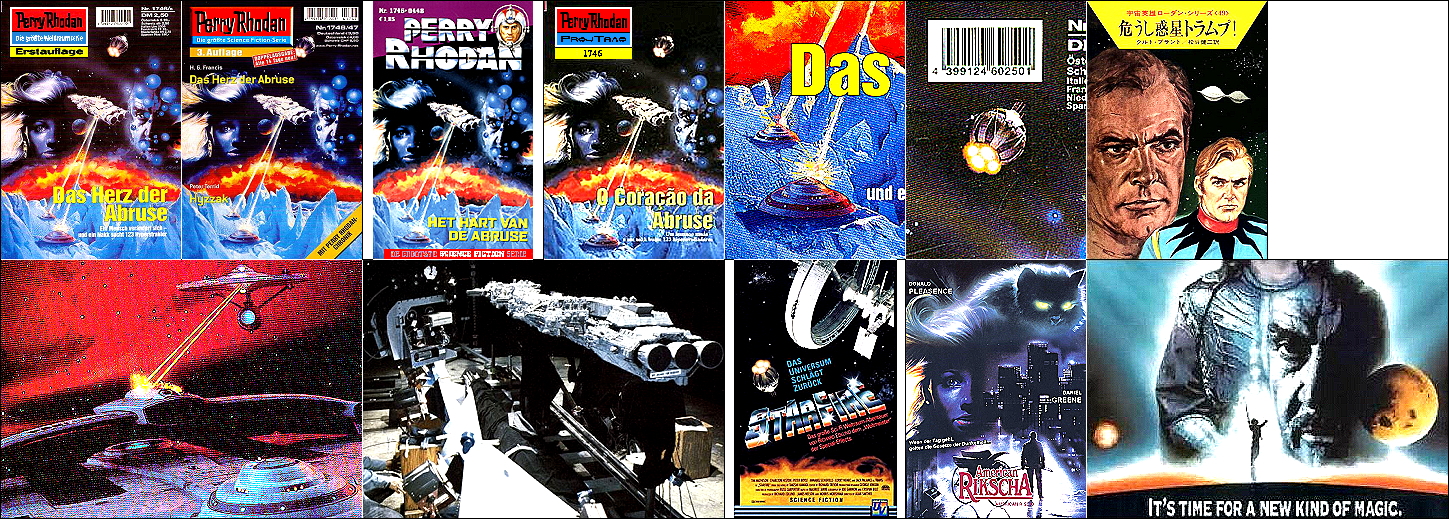 1 - 4 gleiches Bild, die Stationen im Bergmassiv sind von einer Raumschiffsdarstellung aus Star Trek V entnommen, das Raumschiff zwischen den beiden Gesichtern stammt aus dem Film "Spaceballs", das kleine Raumschiff ganz oben aus dem Film "Starfire", das Frauengesicht ist vom Filmplakat in 11 für "American Ritscha" übernommen, das Männergesicht zeigt den schottischen Schauspieler Sean Connery im Film "Highlander II - die Rückkehr", der sich auch in eine japanische Ausgabe verirrt hat |