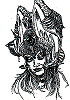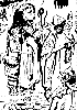 Mann wirft Speer auf Frau, darüber die Köpfe von zwei Frauen |