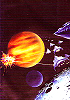 Gucky mit staunend aufgerissenem Mund, gegenüber eine Frau, dazwischen 2 Planetenkugeln und roter Nebel |