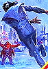 Raumboot beschießt Kuppeln in Gletscherlandschaft, am Himmel die Gesichter eines Menschenpaares. |
