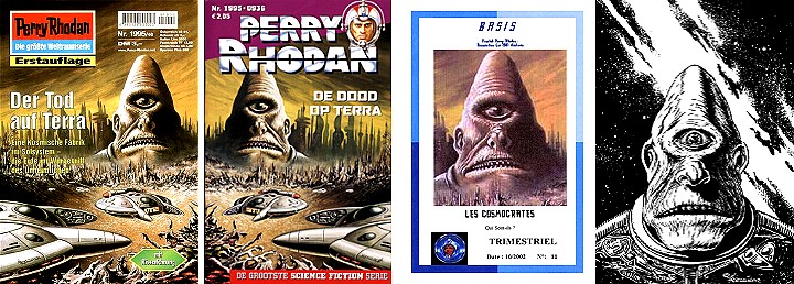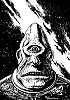 Außerirdischer mit Kegelkopf und Zyklopenauge, davor Space-Jets |