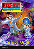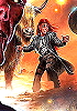 zwei Raumfahrer fliegen im Weltraum hintereinander mit nach oben gestreckten Armen |