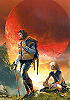 Wanderer und sitzende Frau vor rotem Riesenplaneten