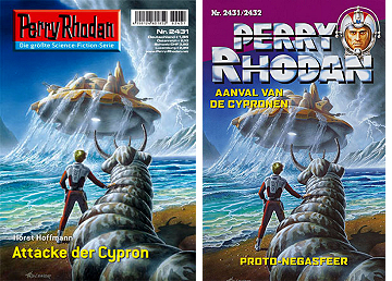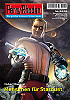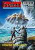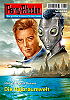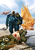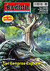 Terraner und riesiges Wurmwesen vor Raumschiff, das sich aus dem Meer erhebt |
