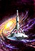 turmartiges Raumschiff mit Galaxisspirale im Hintergrund