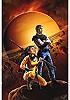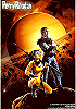 Perry Rhodan und Frau mit Speer nach vorn blickend, dahinter Mond, am Himmel Polyport-Hof |