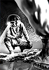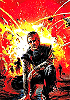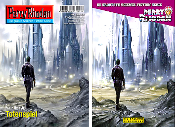 Hockender Mann (1 - 3 Alaska Saedelaere, 4 - 9 Perry Rhodan), der sich mit einer Hand auf dem Boden aufstützt |