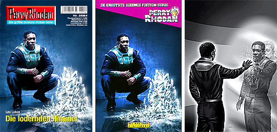 ähnliche Motive, 1 - 3, 9 - 10 gleiches Bild, 5 - 8 gleiches Bild mit gleicher Körperhaltung wie 1, 8 schwarzweiß seitenverkehrt als Innenillu für die PR-Action-Heftserie, in 5 - 8 und 9 - 10 hat Perry die gleiche Uniform an |