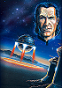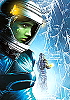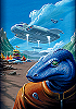 Blauhäutiger echsenartiger Außerirdischer, dahinter Zeltstadt und Raumschiff