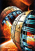 Hintereinander fliegende Raumboote, die die Gestalt von Kugelausschnitten haben