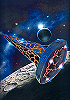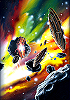 Diskusraumschiffe und Asteroiden, dahinter bunt leuchtende planetarische Wolke