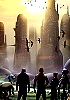 Terraner und Außerirdische stehen vor riesigen Türmen |