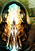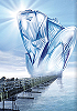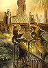 Karawane von Menschen und Tieren geht über Holzsteg, an dessen Ende eine kristallartige Struktur ist