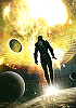 Raumfahrer blickt auf riesige kugelförmige Struktur
