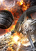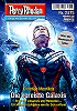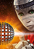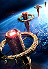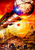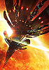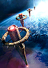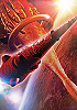 Kugelraumschiff beschießt radförmige Raumstation, dahinter Mond und Planet vor dem Auseinanderbrechen |
