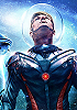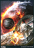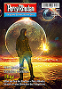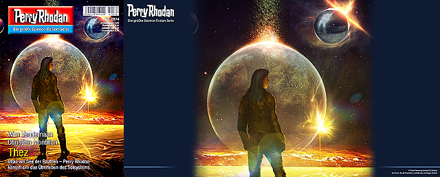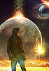 Mensch steht vor Lavameer, im Hintergrund brennender Riesenplanet |