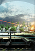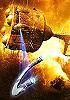 brennendes Kugelraumschiff und dunkelhäutiger Mann