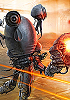 eiförmiger Flugrobter mit Tentakelbeinen schießt aus schwerer Waffe