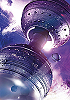 Hantelraumschiff umgeben von violettem Leuchten |