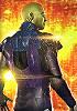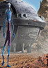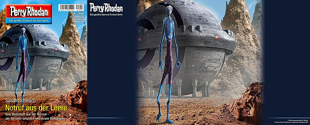Kugelraumschiff in Felswüste, davor extrem schlanker Außerirdischer |