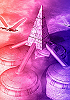 Gebäude mit vier Kugelsegmenen, das mit einer Pyramide und zylinderförmigen Streben verbunden ist |