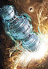 Raumschiff aus übereinander gestapelten Kugelsegmenten wird von Blitzentladungen eingehüllt